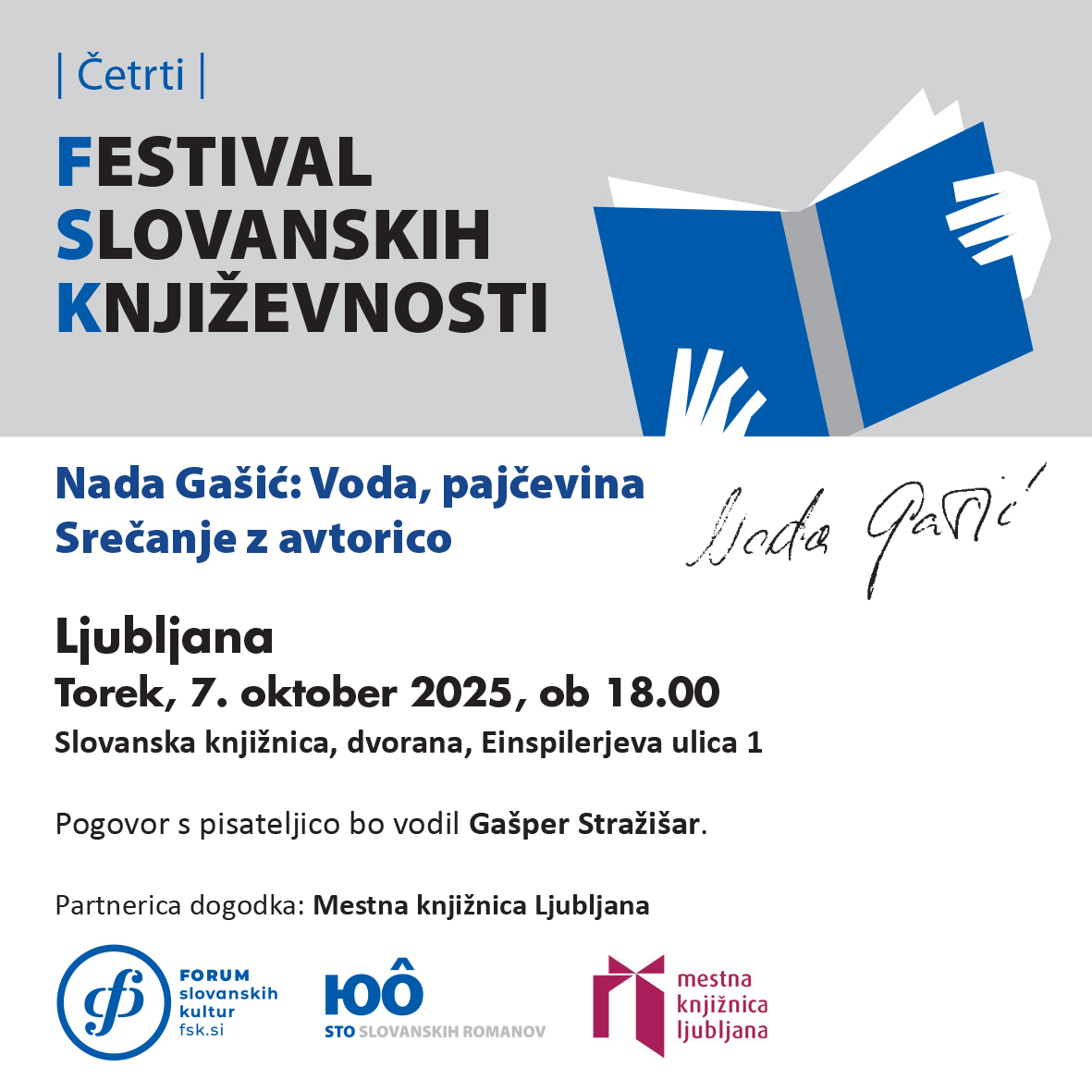 Vljudno vas vabimo na pogovor s hrvaško pisateljico Nado Gašić in predstavitev njene knjige Voda, pajčevina, ki bo v okviru Festivala slovanskih književnosti potekal v torek, 7. oktobra 2025, s pričetkom ob 18. uri v dvorani Slovanske knjižnice na Einspielerjevi 1 v Ljubljani.